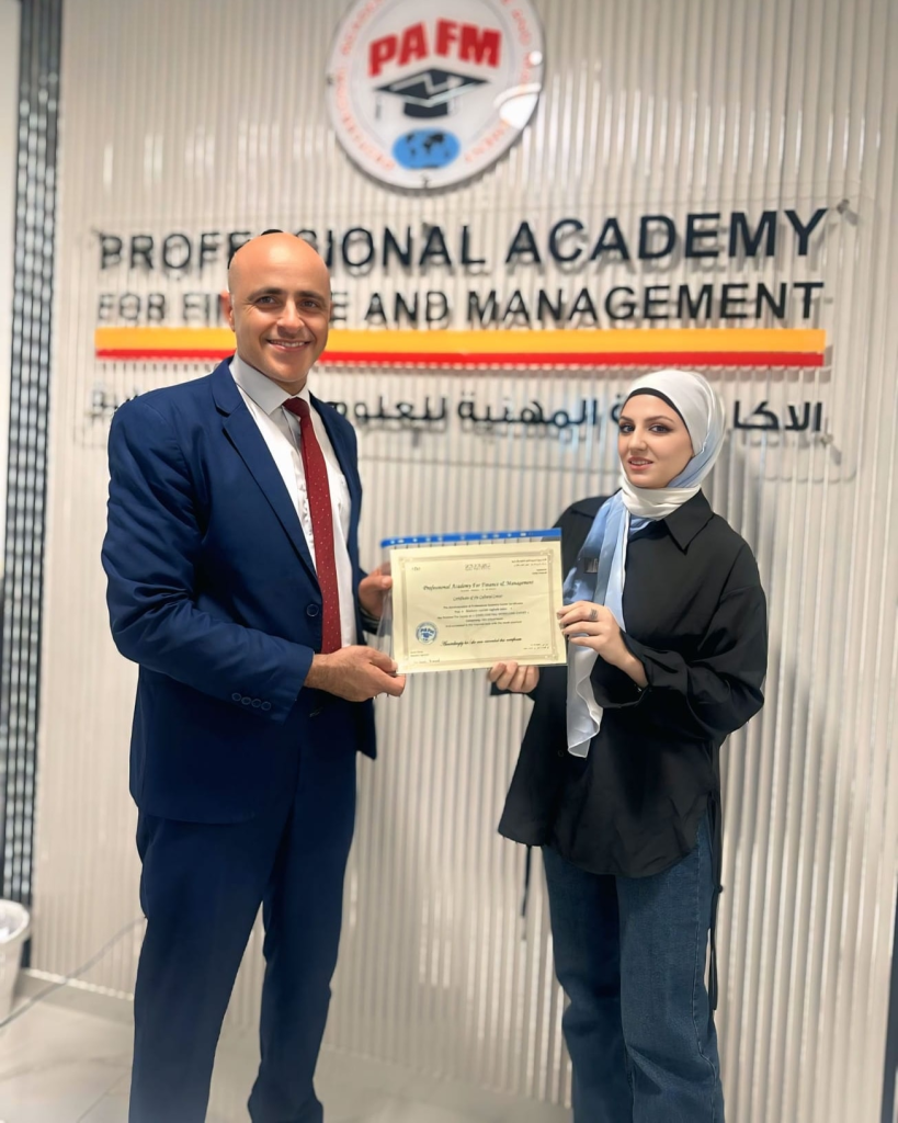 الأكاديمية المهنية للعلوم المالية والإدارية PAFM تهنئ المتدربة المميزة ندين سدر انهاء متطلبات دورة خبير بناء انظمة تكاليف CME نتمنى لها مزيداً من التقدم والنجاح