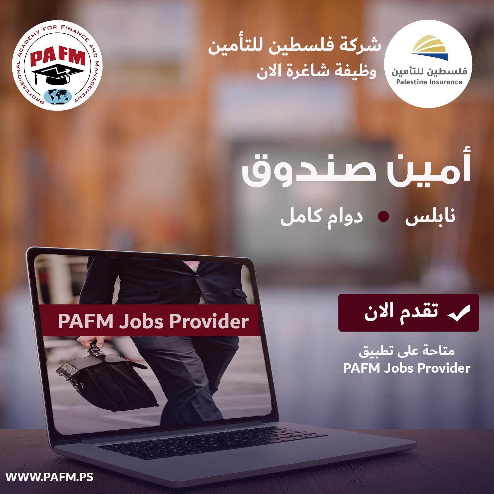فرصتك القادمة تبدأ من هنا… شاغر مميز بانتظارك الآن على تطبيق PAFM Jobs Provider تعلن شركة فلسطين للتأمين عن توفر شاغر وظيفي بعنوان أمين صندوق للعمل لديها في مدينة نابلس ضمن دوام كامل. يشترط أن يكون المتقدم حاصلًا على بكالوريوس محاسبة. على من يجد في نفسه الكفاءة والرغبة في العمل التقدم للوظيفة في أقرب وقت من خلال تطبيق PAFM Jobs Provider