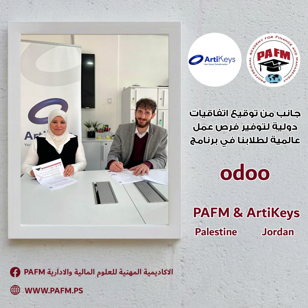 تُعلن الأكاديمية المهنية للعلوم المالية والإدارية (PAFM) عن توقيع شراكة رسمية مع شركة Odoo العالمية،كأول شريك تعليمي معتمد من Odoo في فلسطين لتكون من أوائل المؤسسات التعليمية في الوطن العربي المعتمدة لتقديم البرامج التدريبية الرسمية في نظام Odoo ERP. المعتمدة في أكثر من 175 دولة حول العالم