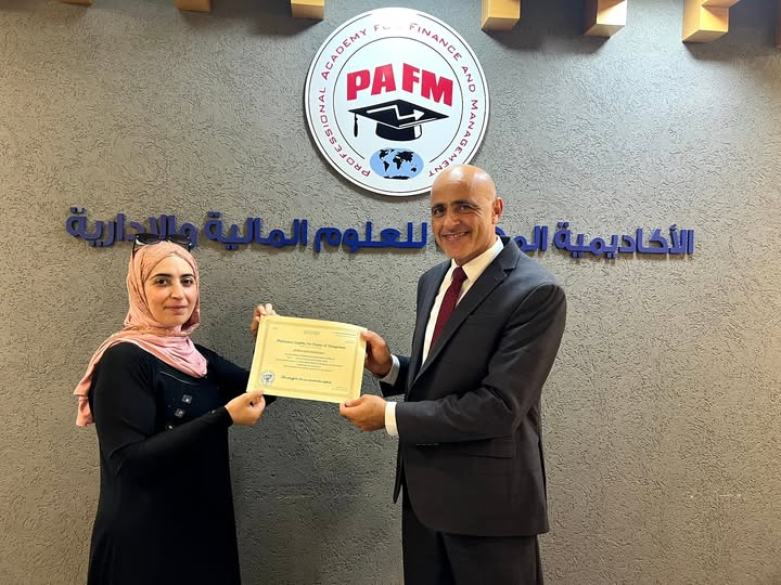 الأكاديمية المهنية للعلوم المالية والادارية تبارك للمتدربة المميزة بيسان عابد إنهاء دورة محاسب مالي محترف PFA وتتمنى لها مزيدًا من التقدم والنجاح