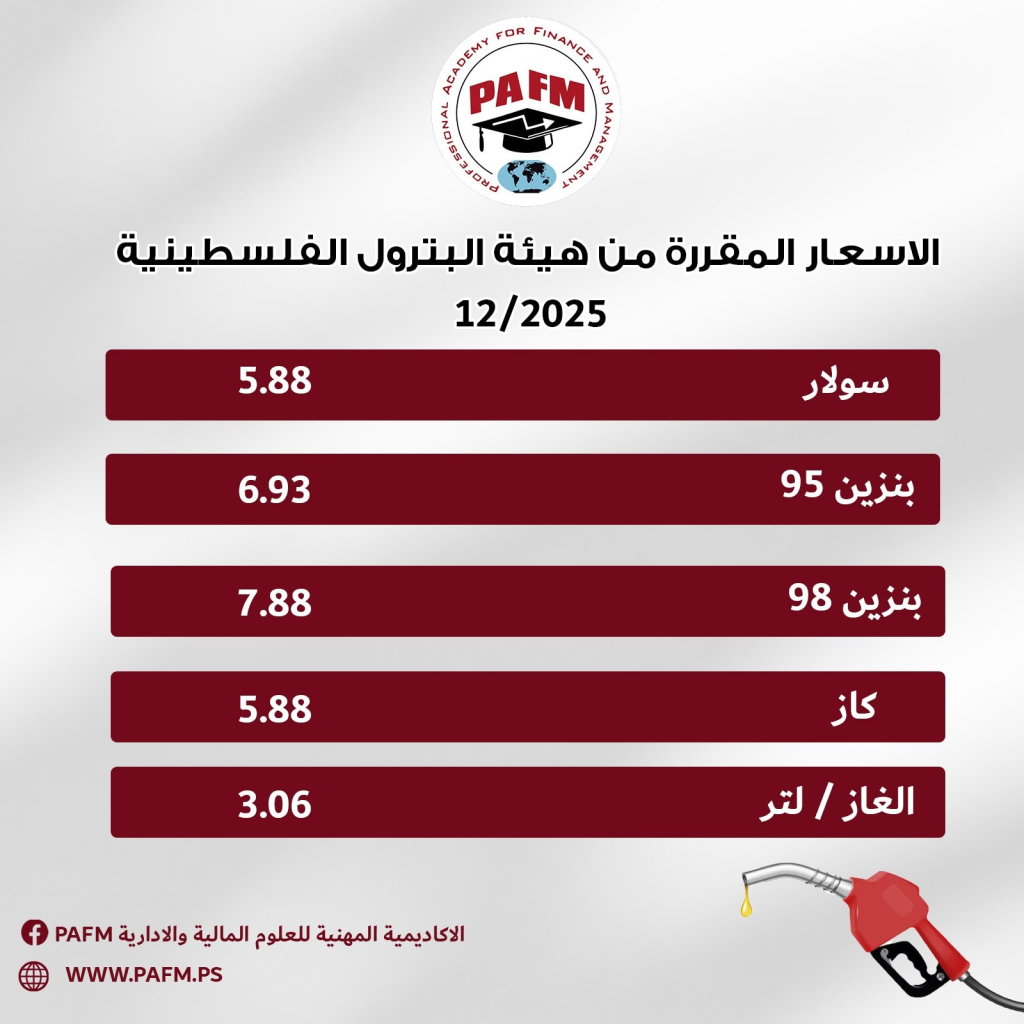 الأسعار المقررة من هيئة البترول الفلسطينية 12/2025 قم بمتابعتنا لتصلك كافة الاخبار الاقتصادية المحلية والعالمية ولتصلك كافة الاخبار حول الوظائف الجديدة.