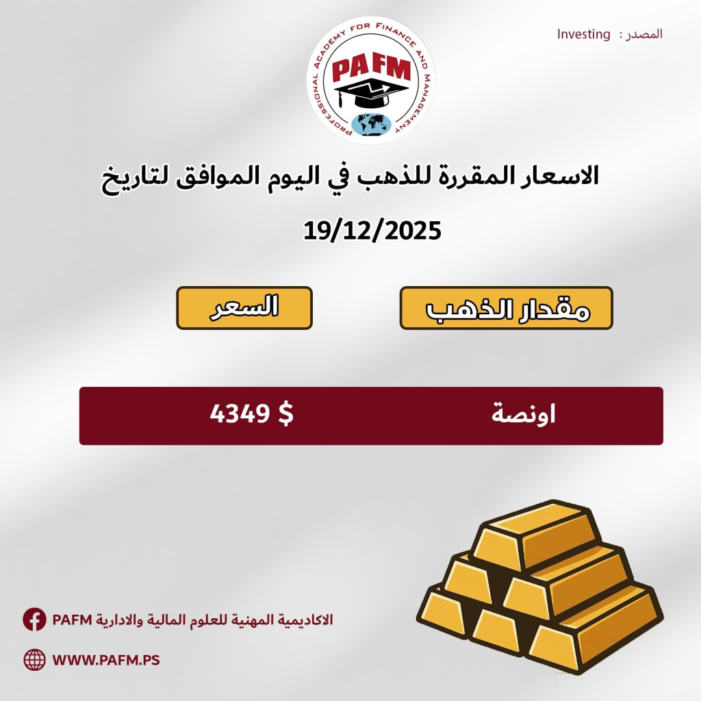 الاسعار المقررة للذهب في اليوم الموافق لتاريخ 19/12/2025 قم بمتابعتنا لتصلك كافة الاخبار الاقتصادية المحلية والعالمية ولتصلك كافة الاخبار حول الوظائف الجديدة.